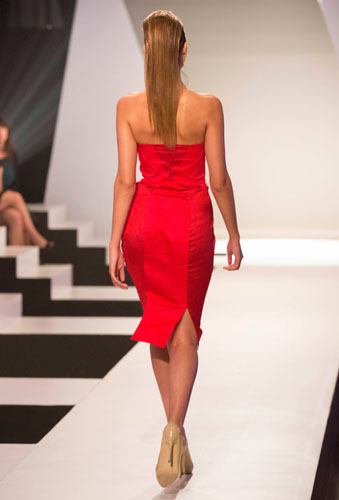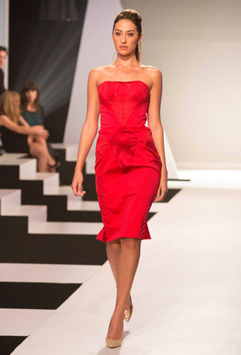 Season 1 Episode 03: "Red Carpet Showdown" First Challenge: Create a red carpet look inspired by Hollywood Glamour. Red cotton sateen with contrasting panels of red silk shantung. Inspired by a gemstone, I alternated panels of the two fabrics to create a shimmering, multifaceted bodice and skirt, shaping the body and cinching in the waist. Model: Bianca Palmerin |