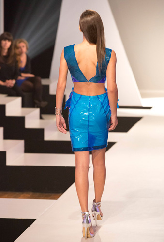 Season 1 Episode 08: "It's an Unconventional Beach Party" Challenge: Create a beach inspired look with found items on the beach. Only closures and muslin were provided, no trip to Mood. Blow up beach chair plastic and muslin. Finned-pocket pencil skirt with angular crop top. Model: Ivana Koreb |